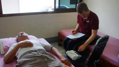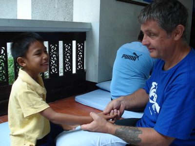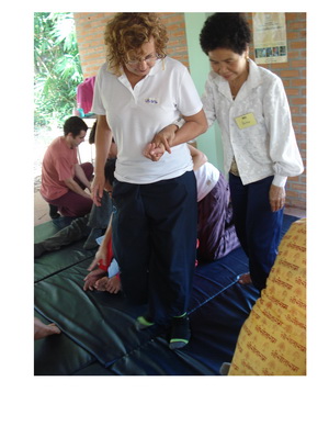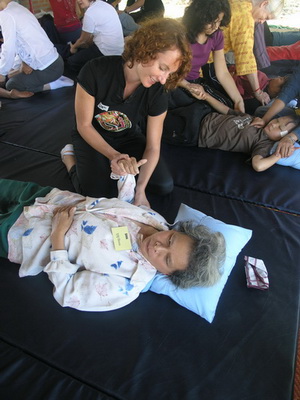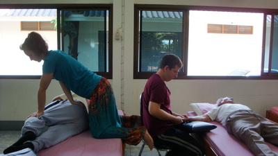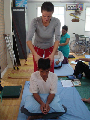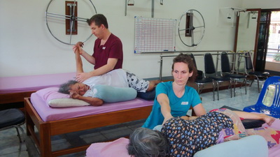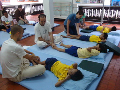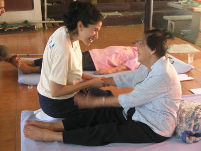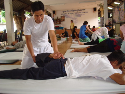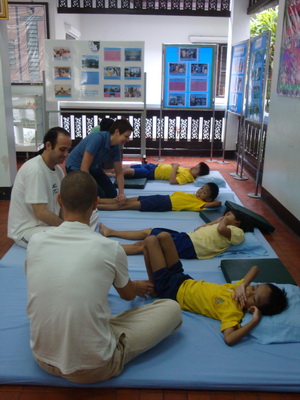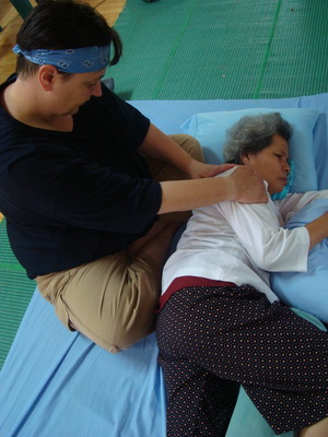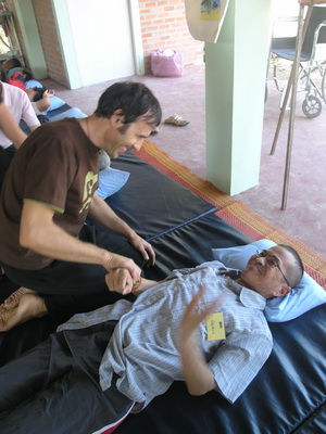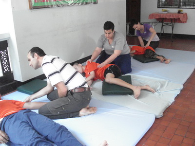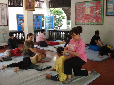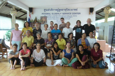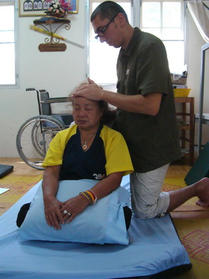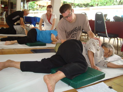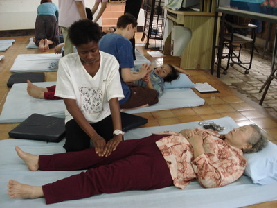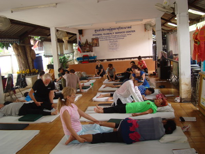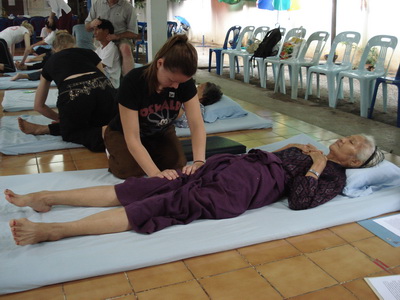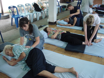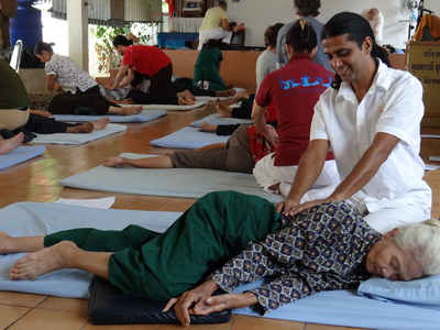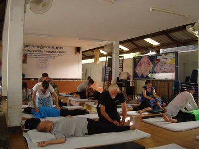 The Government Certified Teacher 600 hour program interns offer therapeutic massage service to the more severe conditions seniors at the retirement center of Chiang Mai. Most of the elderly here have complication of stroke and other ailments.