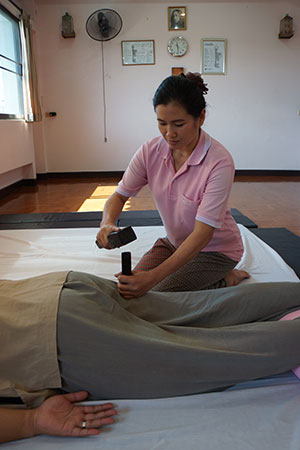 Tok Sen: Tok Sen is an art of massage that part of the ancient art using wooden pads and apply on Sen (massage line) along the body following Sen Sib. This ancient technique is very helpful when apply with Thai massage to reduce tension on large muscle and lessen the strenuous on the therapist thumbs. TMC follow this ancient teaching and apply with Thai massage modality to solve conditions. Students will learn this art in a full day class and will be able to apply with Thai massage technique effectively. The wooden tool set will be given to student at no charge.